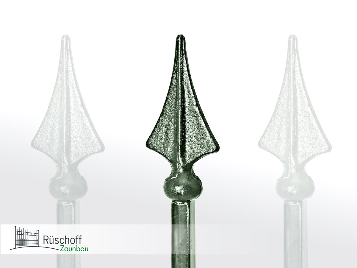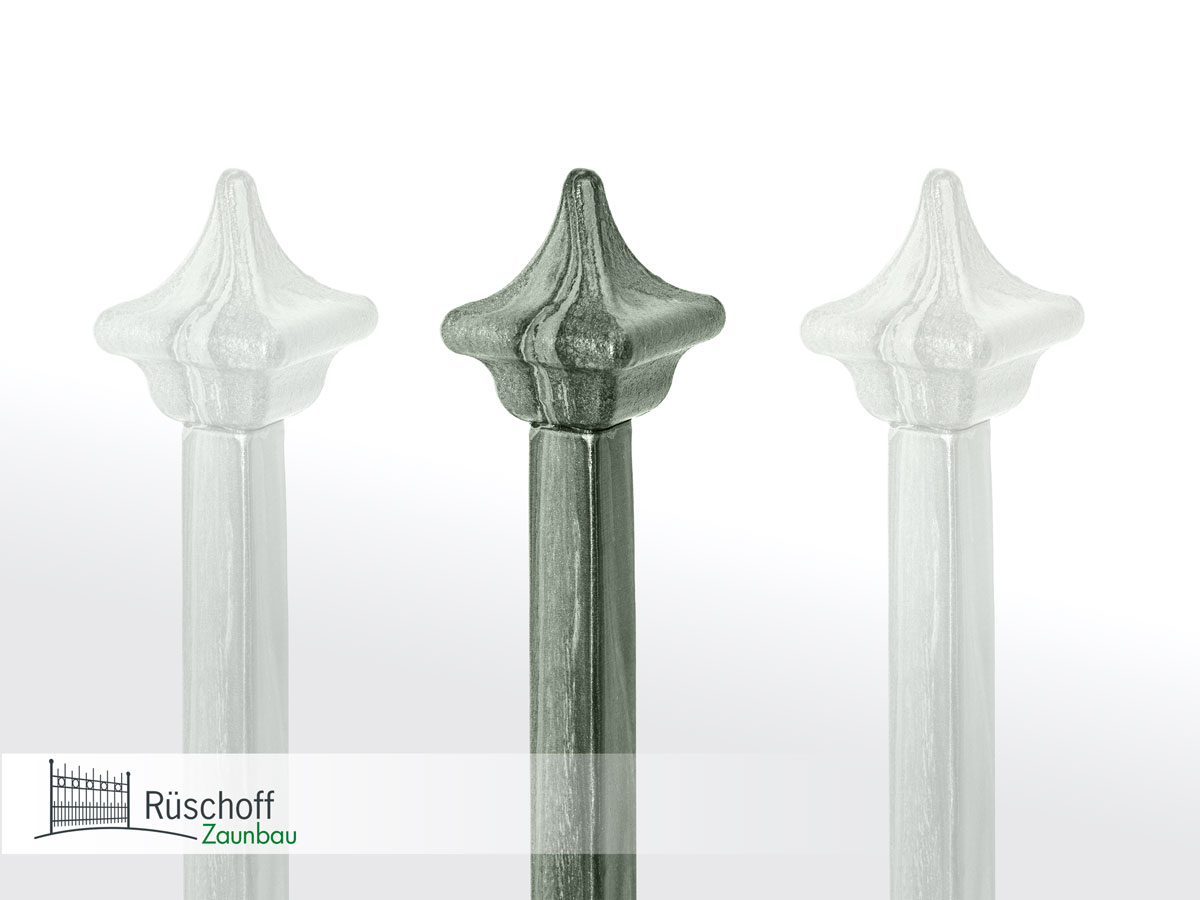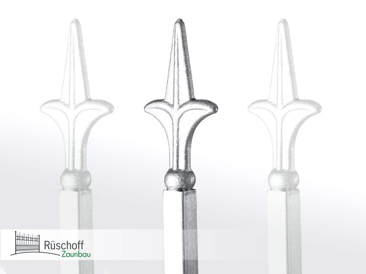 Oben auf: Für einen perfekten Abschluss und als aparte Hingucker auf Ihrem neuen Zaun können Sie sich aus unserem Spitzen-Sortiment bedienen. Ob die klassische französische Lilie oder die puristische Pyramide – ein gelungenes Topping rundet das Ensemble der Zaunelemente professionell ab.